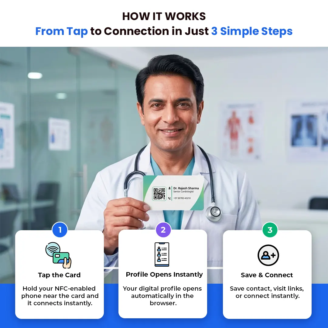 The TapBizCard NFC Business Card for Doctors is a smart digital visiting card that helps you share your clinic and professional details instantly. With a simple tap on any NFC-enabled smartphone, patients can access your contact information, clinic address, consultation timings, and appointment links within seconds.