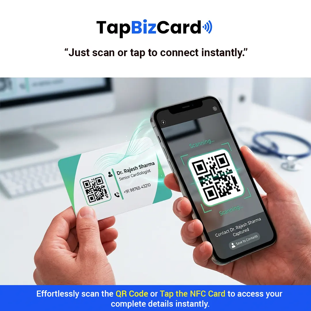 The TapBizCard NFC Business Card for Doctors is a smart digital visiting card that helps you share your clinic and professional details instantly. With a simple tap on any NFC-enabled smartphone, patients can access your contact information, clinic address, consultation timings, and appointment links within seconds.